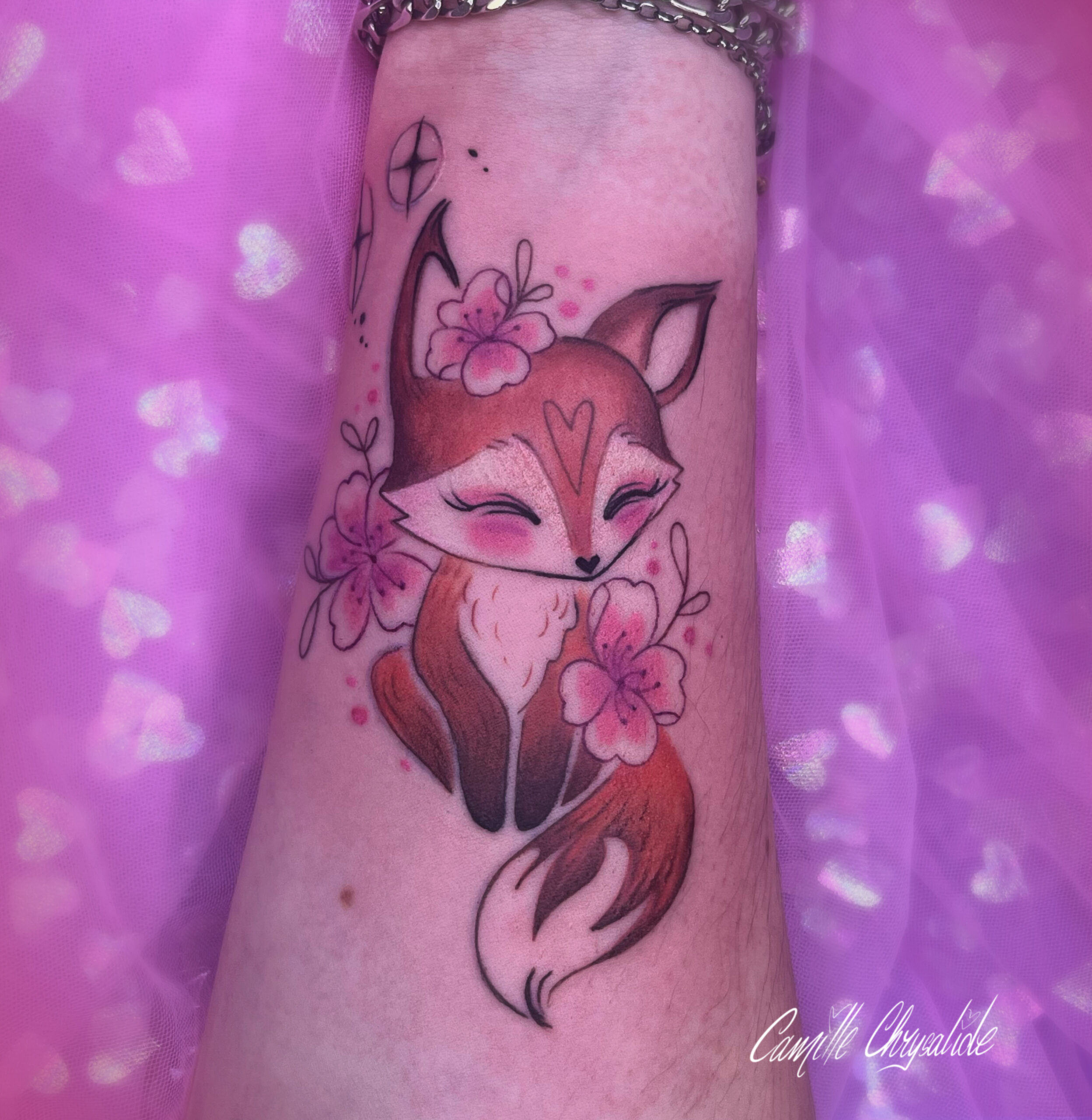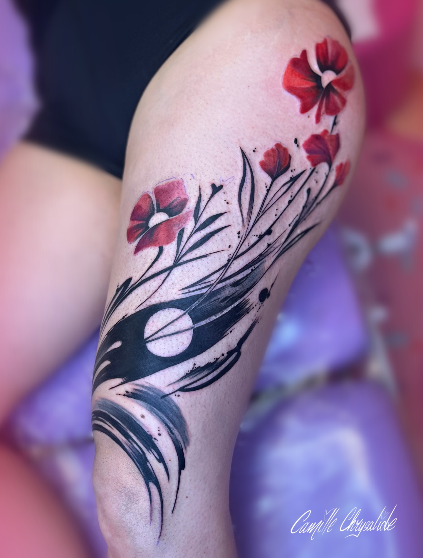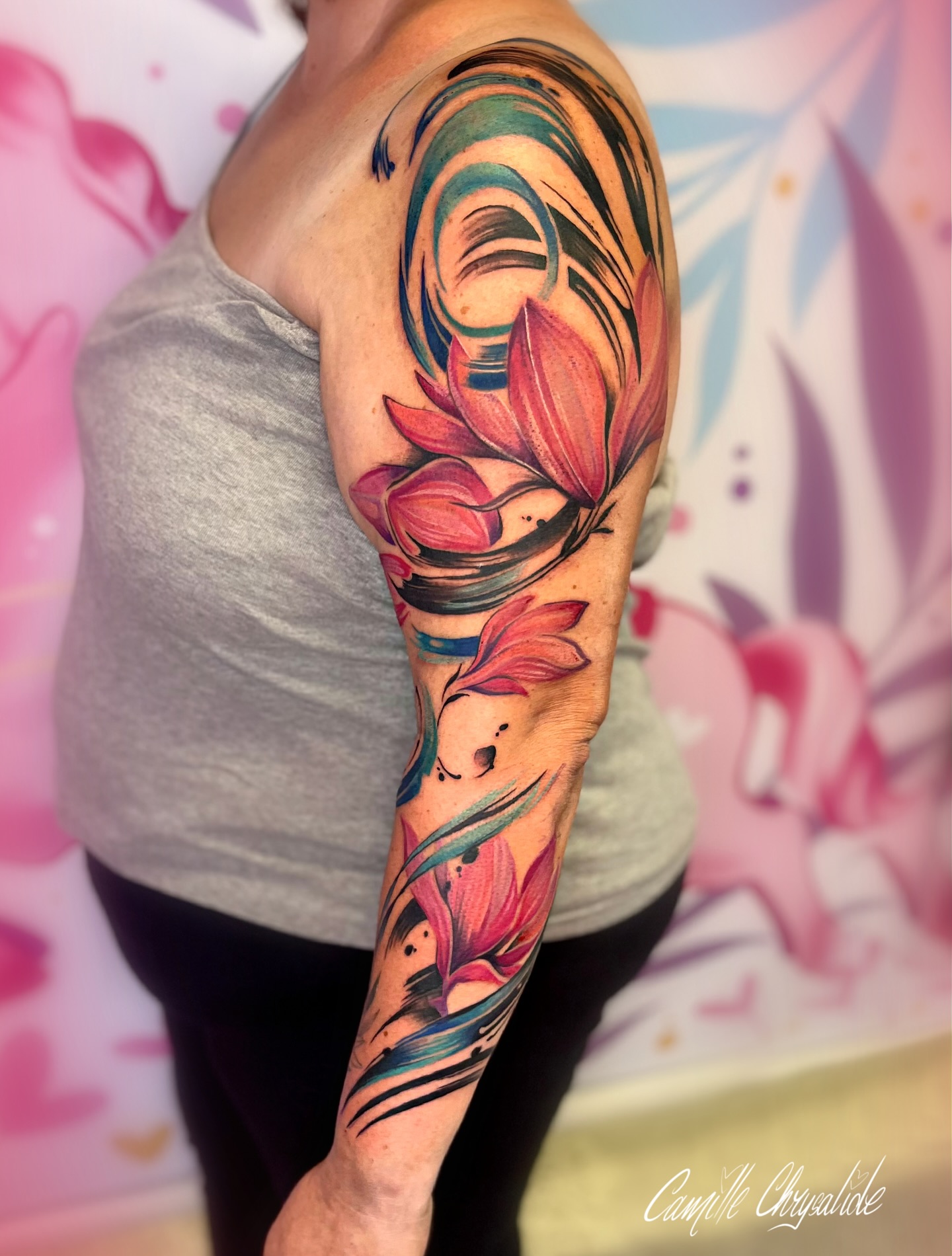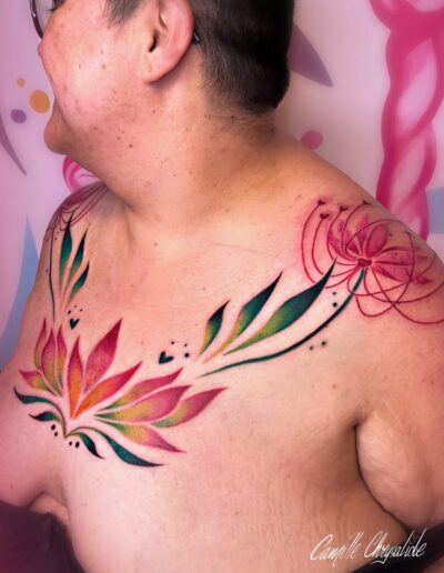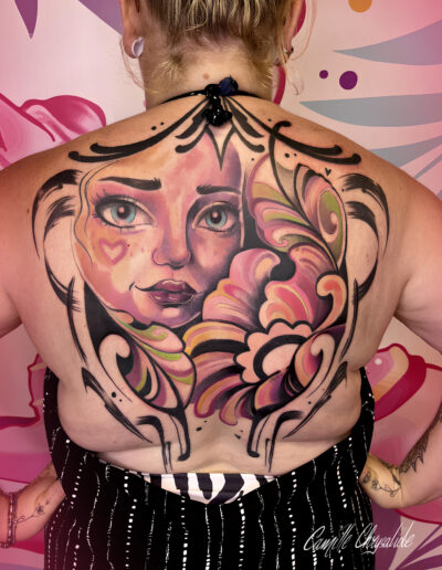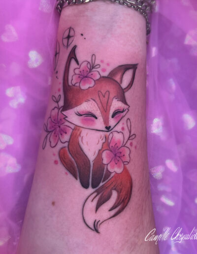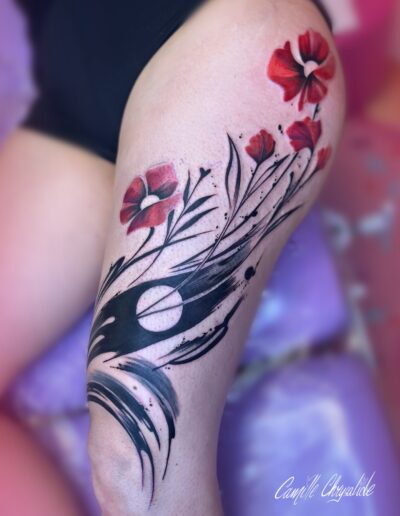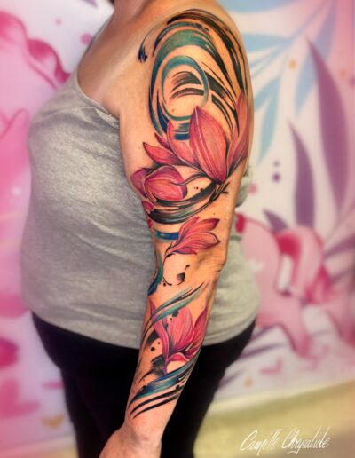 Je réalise pour ma part des tatouages colorés et plein de fleurs. En dehors de cela, je créé également des tableaux, goodies et autres joyeusetés. Je chante à mes heures perdues, et j’ai un don pour les blagues très nulles. Je les partagerai volontiers avec vous (navrée) pendant les séances de tatouages!