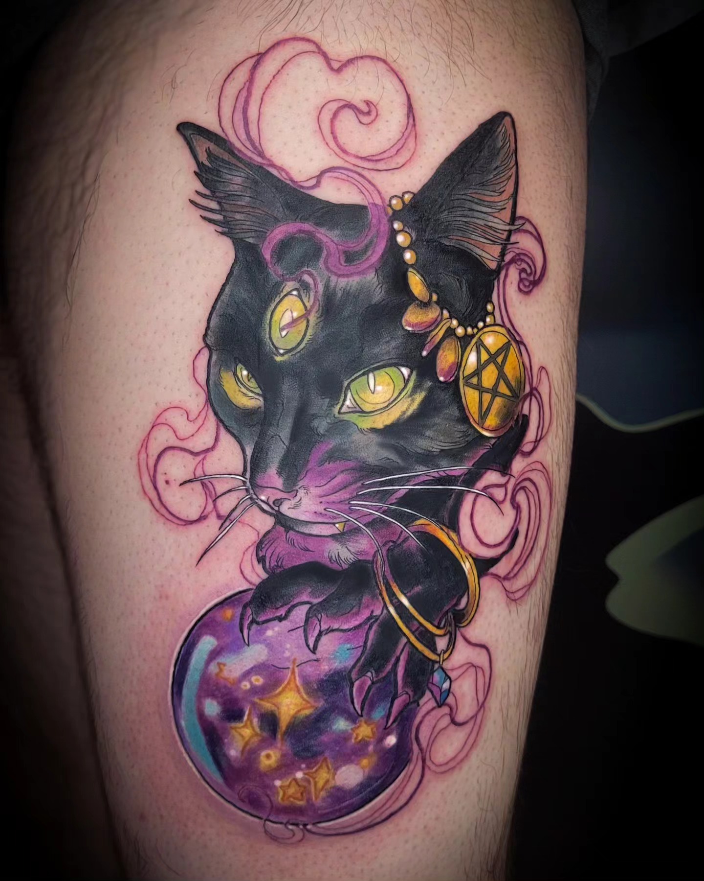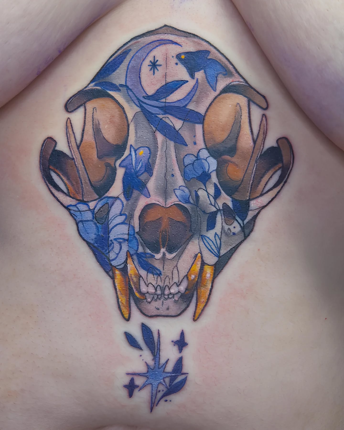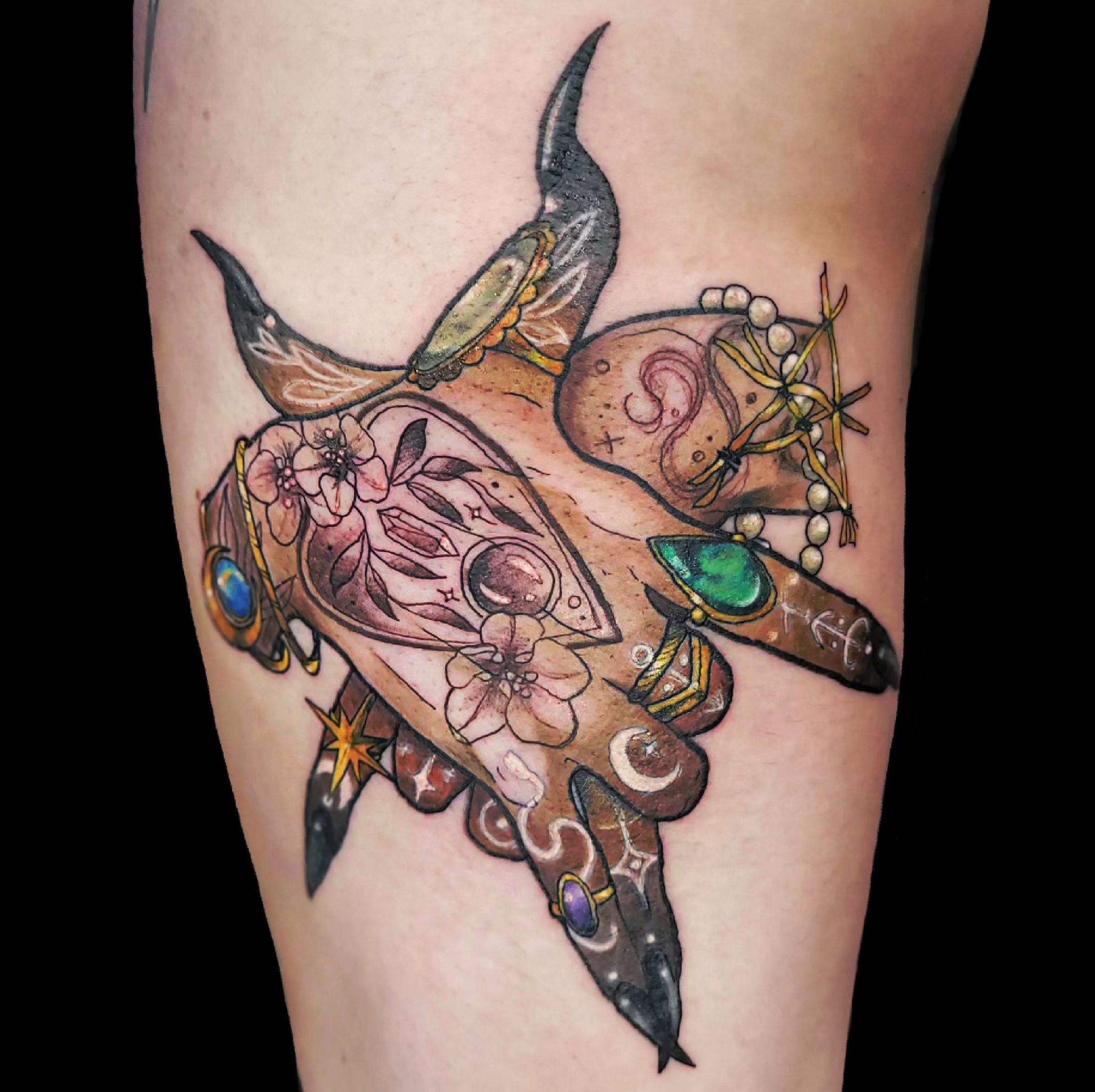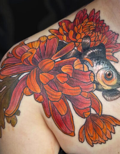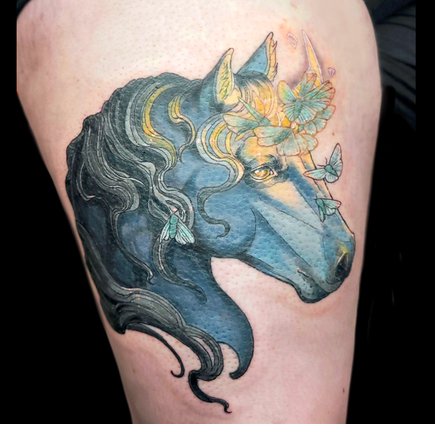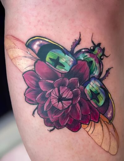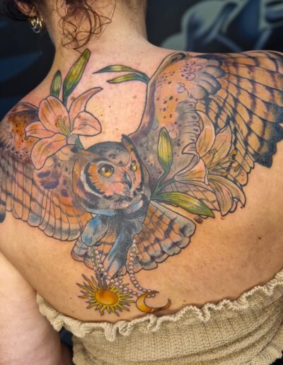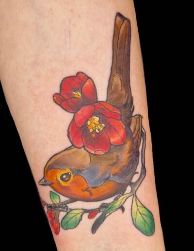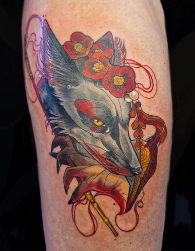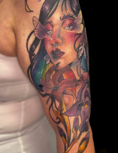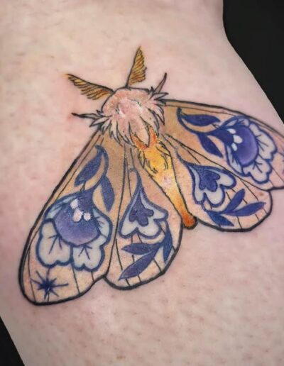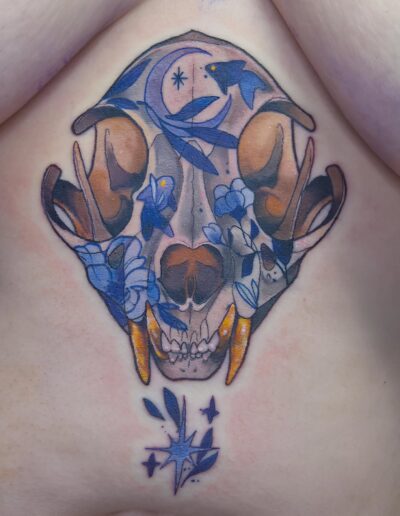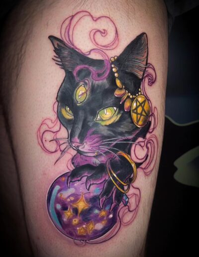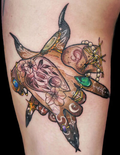 Je suis passionnée de dessin depuis toujours et de tatouage depuis quelques années, la découverte du style néo trad à été pour moi une vraie révélation et un vrai coup de cœur artistique. C’est donc dans ce style que je me ferais un plaisir de vous pimper un bout de peau, dans la joie et la bienveillance. J’aime particulièrement aborder les thèmes de la sorcellerie, la flore et la faune (j’aime aussi beaucoup faire des mains), mais en soit j’aime tout du moment qu’il y a de la couleur. Cela n’empêche pas d’apporter à mes pièces une ambiance sombre, digne des sorcières modernes. A coté du tatouage je crée également des illustrations pour pleins de goodies infusés de magie.