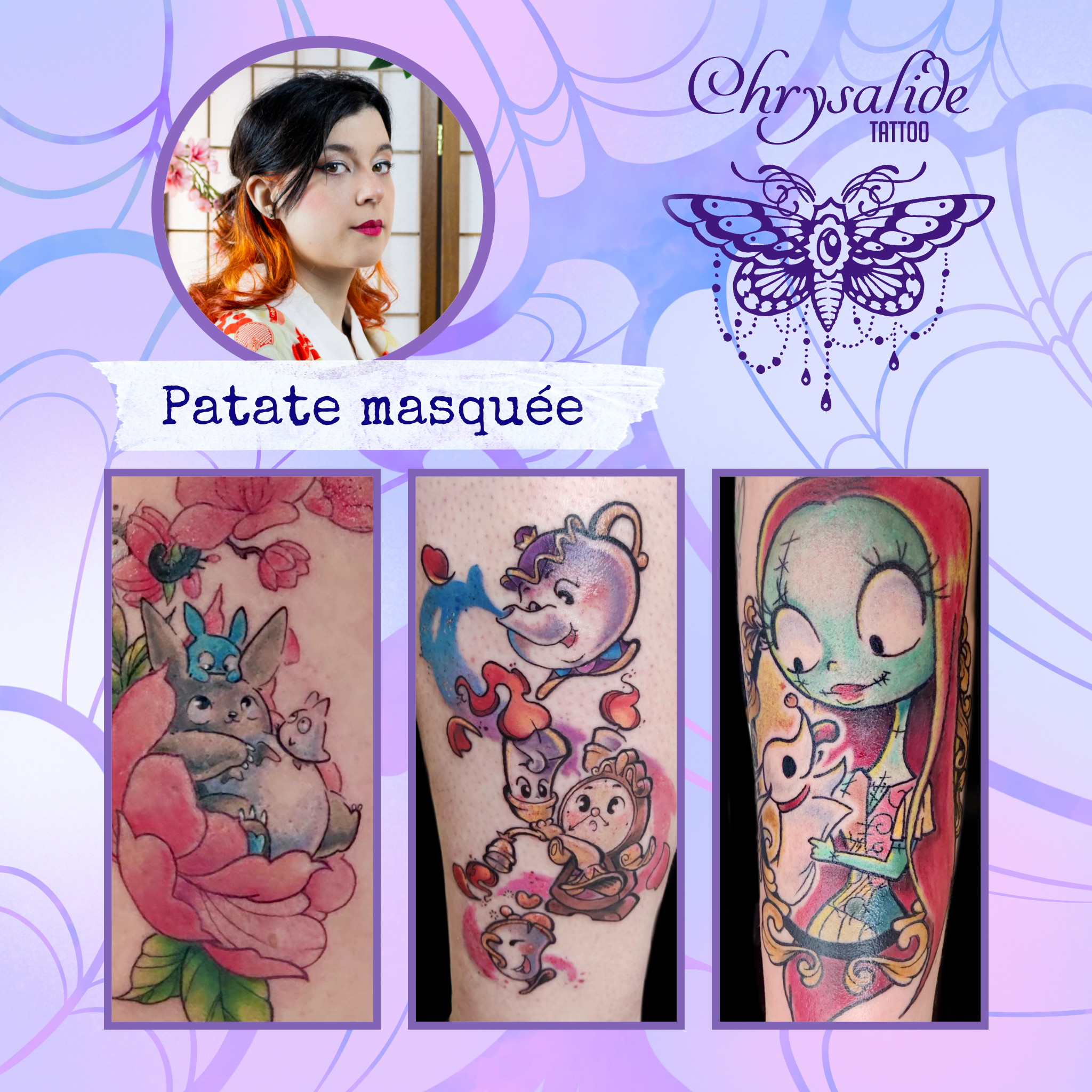 Coucou ici Patate ! Issue du monde de l’informatique, je tapotais avec mes petites racines sur mon clavier tout en rêvant de vivre du dessin. En fin 2020 l’équipe de Chrysalide tattoo m’a offert la chance de pouvoir venir apprendre le métier de tatoueuse à ses côtés.